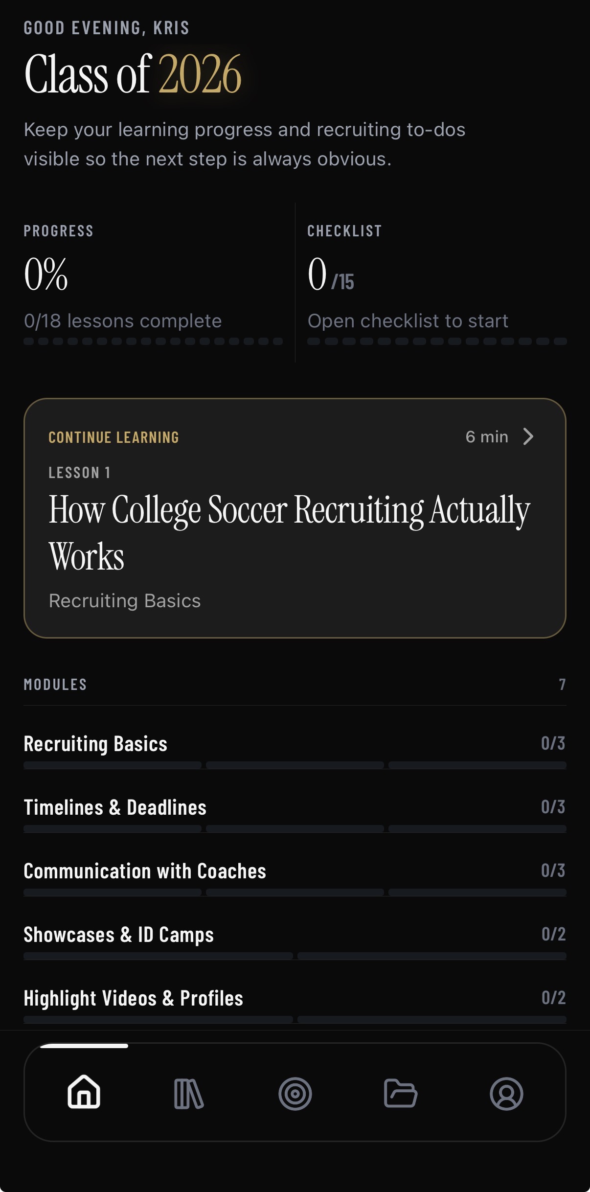 Progress, checklist, and current lessons stay in one place so players always know what to do next.